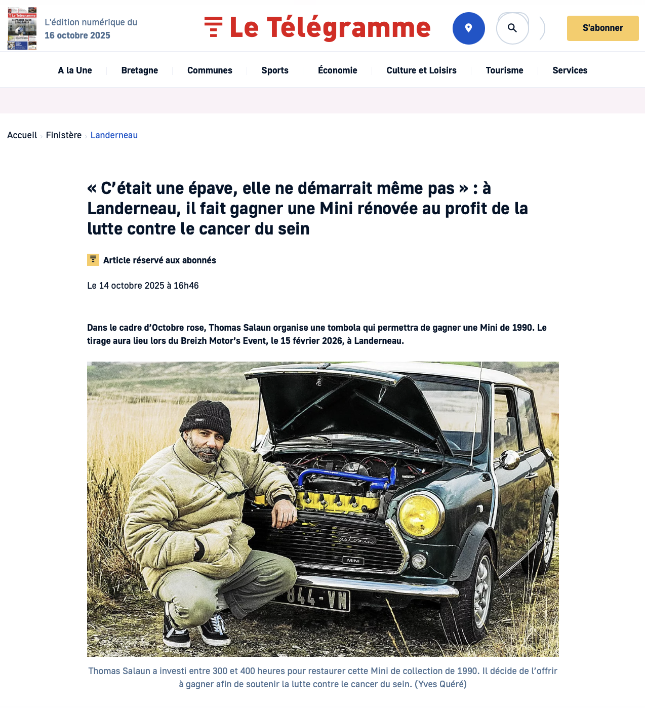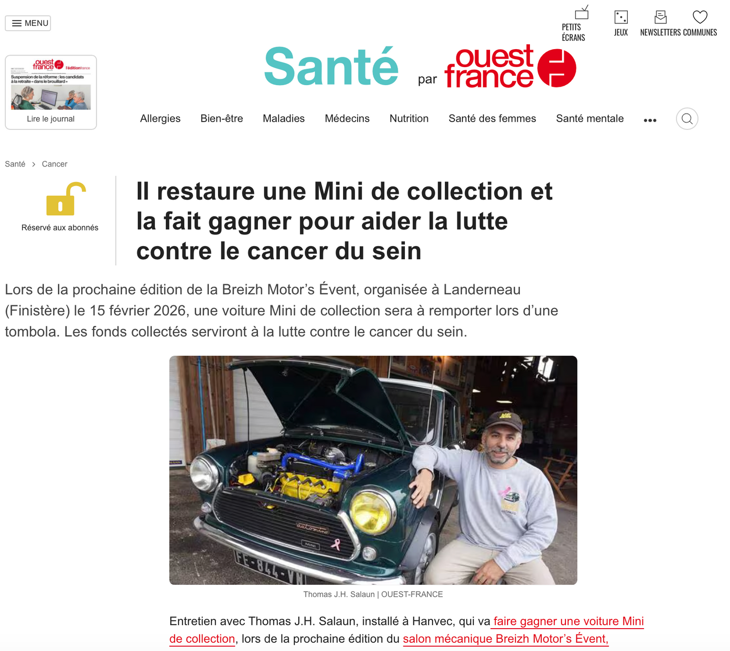 Entretien avec Thomas J.H. Salaun, installé à Hanvec, qui va faire gagner une voiture Mini de collection, lors de la prochaine édition du salon mécanique Breizh Motor’s Évent, organisée à Landerneau (Finistère) le 15 février 2026. Il la restaure depuis 2021. Tous les bénéfices seront reversés à la Fondation ARC, qui lutte contre le cancer du sein.